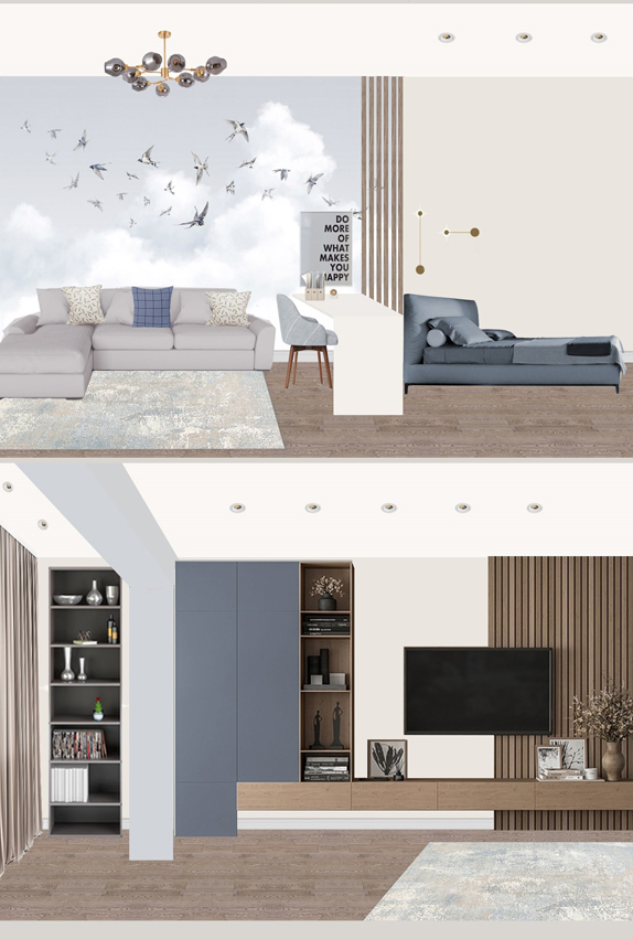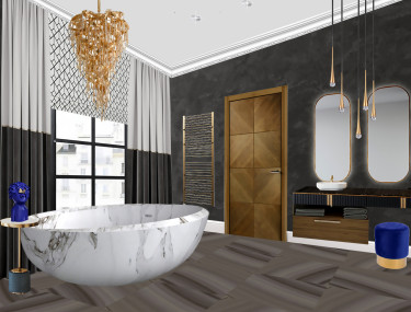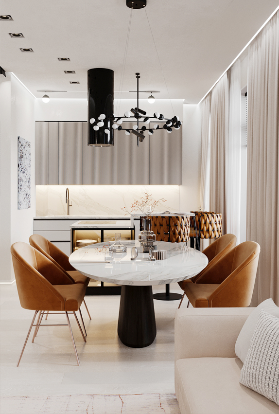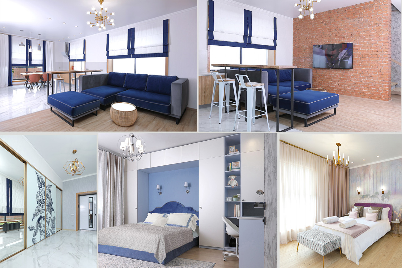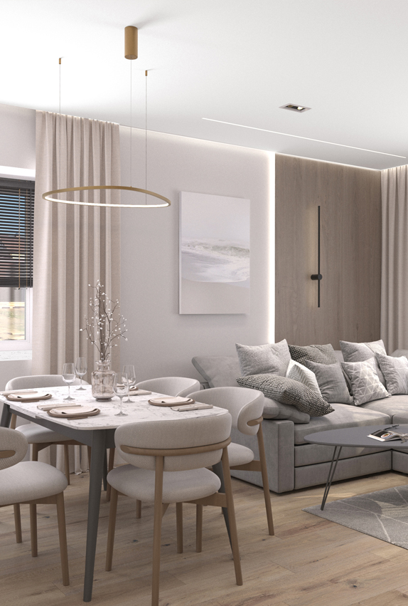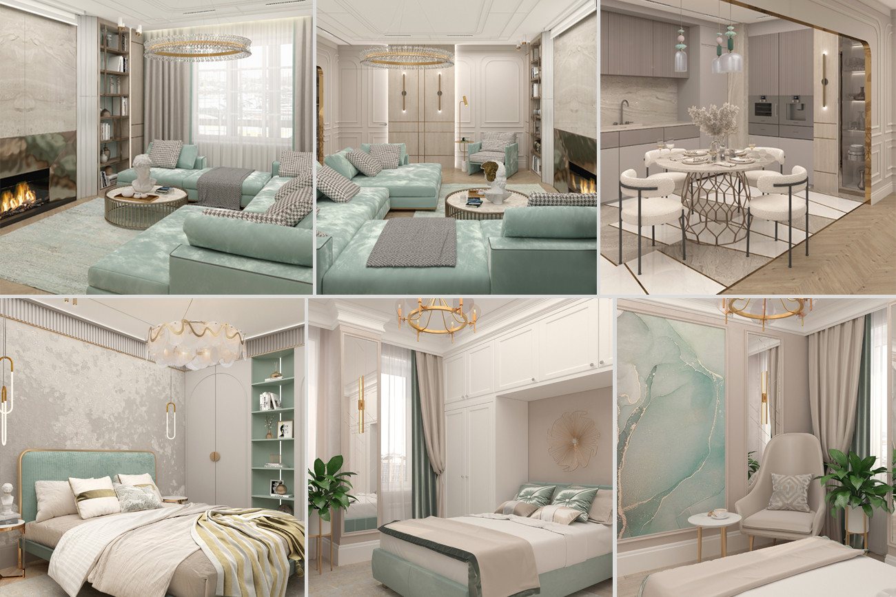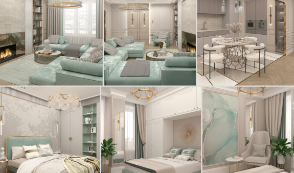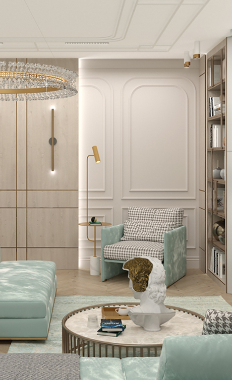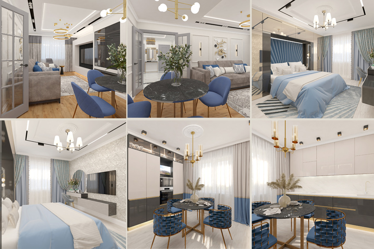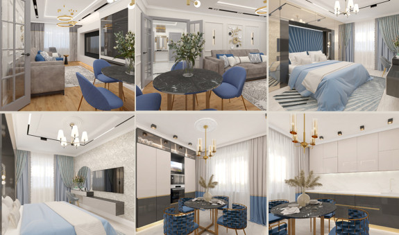 Легкость, воздушность, ощущение свежести — все это присуще этому проекту он создавался с расчетом на то, что новая обстановка станет идеальным местом отдыха в кругу семьи для деловой самодостаточной женщины. Современный микс деталей и материалов, а также актуальная колористика — таков рецепт этого интерьера. Ощущение тепла сюда привносят визуально выразительные фактуры и разнообразие текстильных элементов. Неизменно стильное сочетание добавляет золото ,латунь и бронза, они используются для изысканных акцентов и эффектных штрихов, подчеркивая глубину темно-синего, голубого и серого.