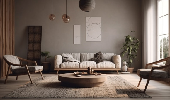 Предпочтение отдано натуральным материалам: каменю, дереву, натуральным тканям . Мебель и предметы интерьера, для легкости восприятия, используются простых геометрических форм. В созданном интерьере мало деталей, но каждая из них тщательно подобрана, фокус на цветовых нюансах, гармонично подобранных оттенках и самом необходимом.
