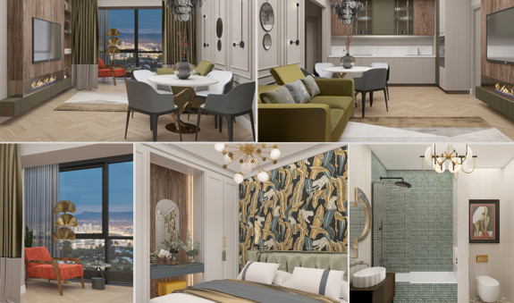 «Яркость» и индивидуальность интерьера достигается за счёт оригинального сочетания классических элементов в виде лепнины, молдингов, арочных сводов, с современными люстрами, бра, зеркалами, дверями и акцентной мебелью.